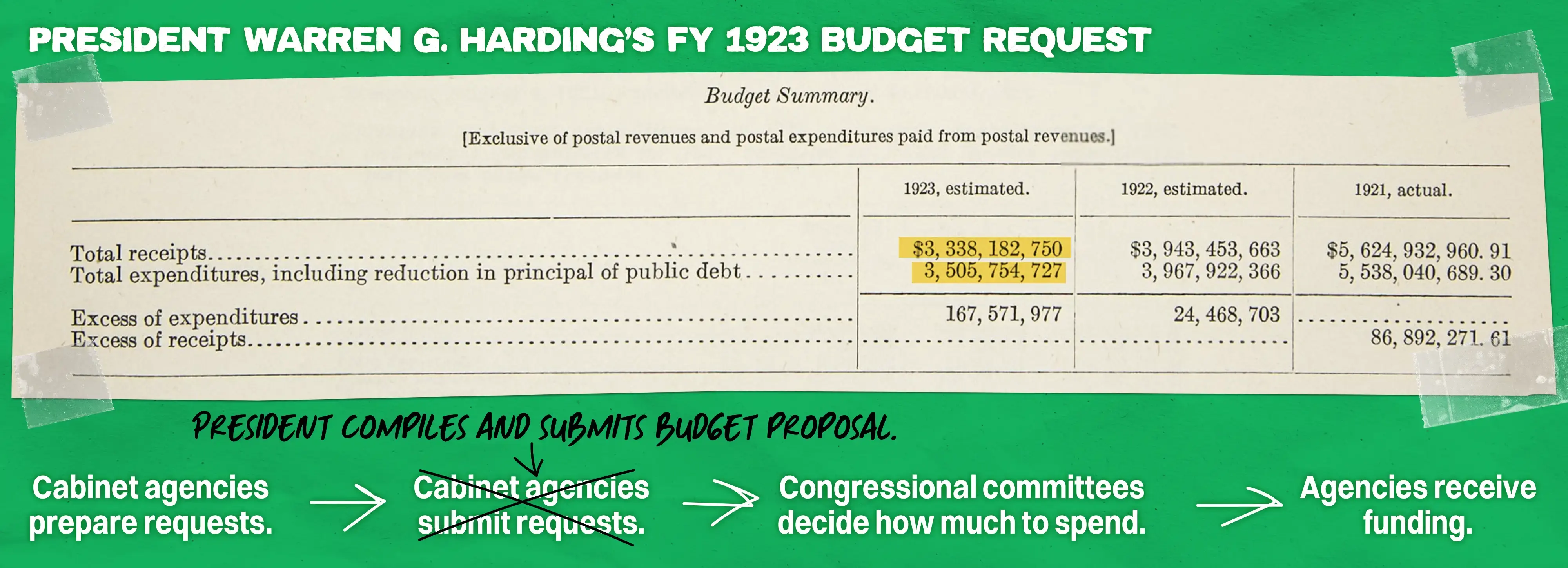In 1921, Congress passed the Budget and Accounting Act, giving the president a more prominent role in managing America’s finances. Specifically, the Act made a few big changes: